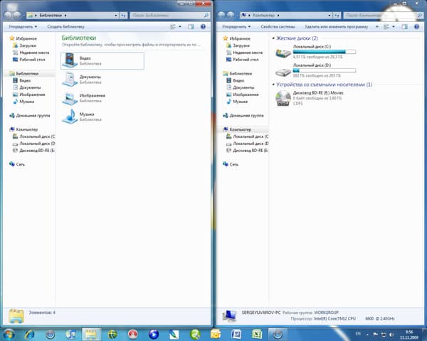 Далее, Проводник теперь имеет отдельный значок в Панели задач и по умолчанию показывает нам библиотеки пользователя (раньше это называлось Мои документы).