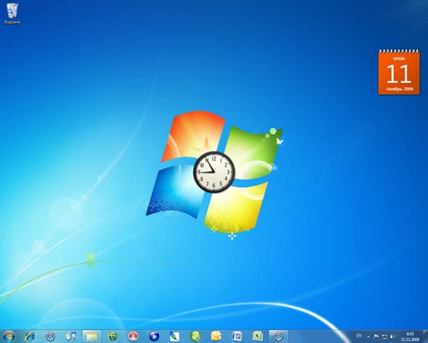 Последнее, о чем стоит сказать, о гаджетах. Над ними Microsoft тоже неплохо поработала, сделав этот инструмент действительно удобным и полезным. Теперь гаджеты могут располагаться в любом месте рабочего стола, а не на отдельной панели, как в Vista. На представленном ниже скриншоте обратите внимание на расположение гаджета Часы.