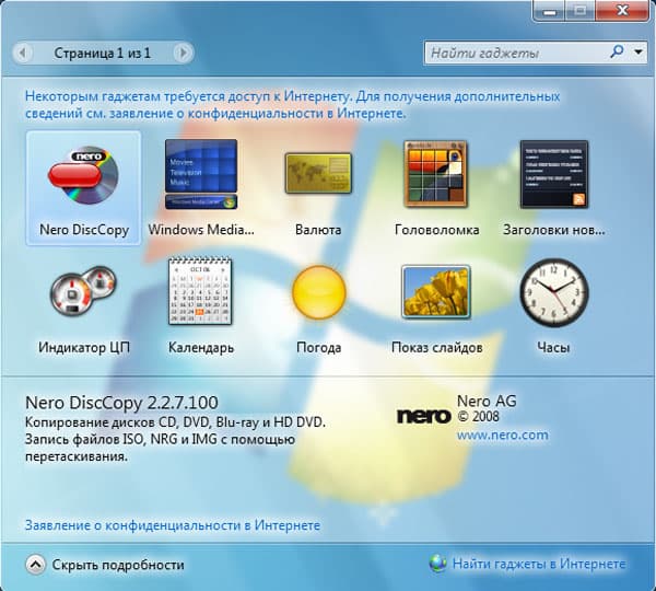 На данном скриншоте показано меню гаджетов с Nero DiscCopy, появившееся после установки пакета Nero 9.
