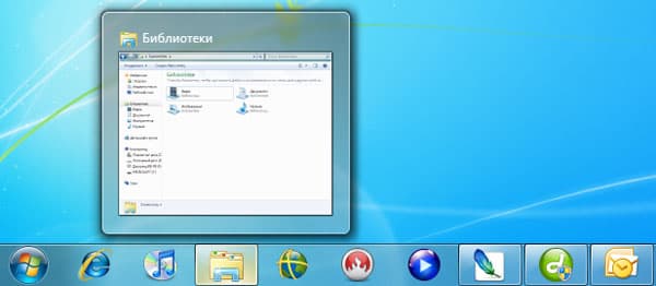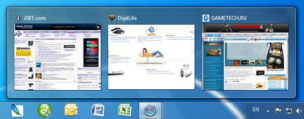 Вероятно, все это было придумано не без влияния (прямого или косвенного) компании Apple и ее системы Mac OS X, где нижняя панель (Dock) является основным инструментом для запуска программ. Но разработчики Microsoft пошли дальше и придумали такую «фишку»: если вы наведете мышку на иконку открытого приложения или окна, то увидите его миниатюру, причем в этой миниатюре будут отражаться в реальном времени все процессы.