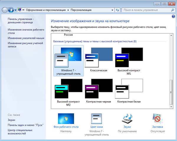 Впрочем, как и в Vista, Aero можно отключить. Для этого надо зайти в Панель управления / Оформление и персонализация / Персонализация, после чего выбрать в списке тем Базовые (упрощенные) темы. Здесь нам предлагают
