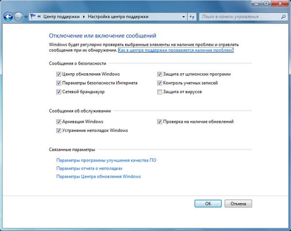 Щелкаем по флажку — и открывается окошко, где перечислены все оповещения безопасности. Там же можно и открыть центр поддержки. Если же вы считаете, что оповещений слишком много, то это можно изменить в Настройке центра поддержки.