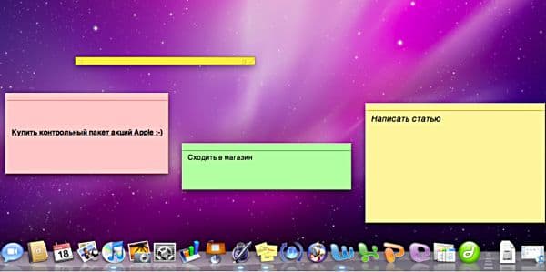 Также можно менять размер листочков. А размещать записки можно в любом месте рабочего стола. Все вроде бы прекрасно, и лично я записками в Windows 7 действительно пользуюсь очень часто. Но давайте посмотрим, как обстоят дела у конкурентов! В операционных системах Apple аналогичный инструмент (Заметки) присутствует уже много лет. В текущей версии Mac OS X (10.6 Snow Leopard) в записках можно делать все то же, что и в виндусовском Sticky Notes, а помимо этого — менять шрифт и сворачивать записки в узенькую полоску (чтобы не слишком загромождать рабочий стол).
