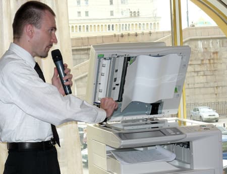 Александр Степанов представил три новых многофункциональных аппарата серии MB OffceCenter. Первым был показан аппарат MB OfficeCenter 120С. Это полноцветное МФУ формата А4 оснащено функциями факса, принтера и сканера и по стоимости отпечатков приближается к монохромным устройствам. 120С предназначен для средних и малых рабочих групп и оснащен сетевым интерфейсом.