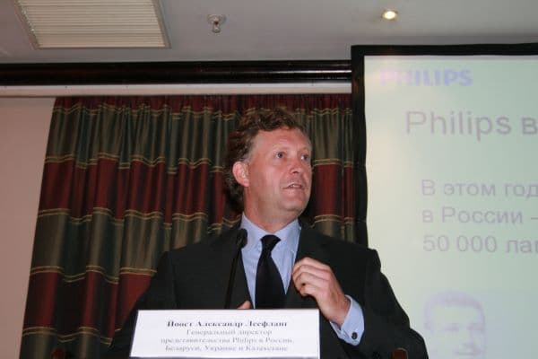 На юбилейном мероприятии представители компании рассказали о трех основных развиваемых Philips направлениях: это Consumer Lifestyle (потребительские товары), Healthcare (решения для медицины) и Lighting (освещение). А открыл мероприятие генеральный директор российского представительства Philips Йоост Александр Леефланг (на фото вверху). Он сделал экскурс в историю Philips, но главное — озвучил мысль, что страны БРИК (Бразилия — Россия — Индия — Китай) являются наиболее перспективным рынком для компании, так как западноевропейский рынок переживает стагнацию, а американский — вообще падает. Однако, непосредственно о продуктах компании речь пошла уже на презентациях секторов (направлений).