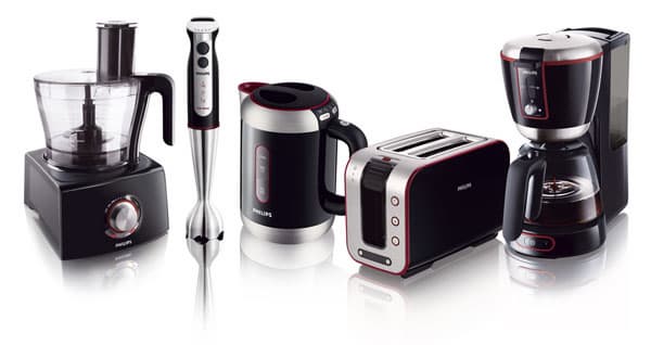 Еще одна коллекция для кухни — Black&White. В нее входят тостер, чайник, кофеварка, ручной блендер и кухонный комбайн — набор, весьма близкий к алюминиевой коллекции. Но зато дизайн — иной (хотя и не менее стильный). Глядя на название, можно предположить, что цветовая палитра будет ограничена черным и белым, но дизайнеры Philips поступили оригинальнее: доминирующий цвет только один (либо белый, либо черный — на ваш выбор), зато окантовка — красная (в обоих вариантах). Также присутствует ряд деталей из нержавеющей стали, что добавляет серебристые ноты в черно-(бело-)красную гамму.