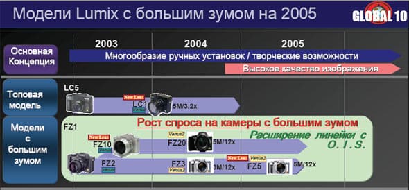 Линейка цифровых камер Lumix 2005 года с большим зумом пополнилась 5-мегапиксельной DMC-FZ5, которая сочетает 12-кратное оптическое увеличение и стабилизатор изображения MEGA O.I.S. в компактном корпусе серебристого или черного цвета.