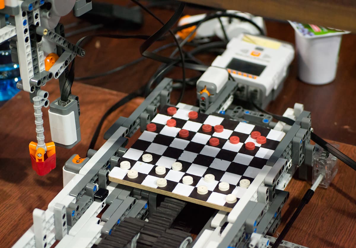 А вот этот робот, как нетрудно догадаться, играет в шашки. На самом деле это весьма сложная система, распознающая положение фишек, и мостовой кран с манипулятором-захватом для их передвижения. Осталось неизвестным, как реализован сам алгоритм игры — на контроллере Lego или всё это управляется «большим братом».