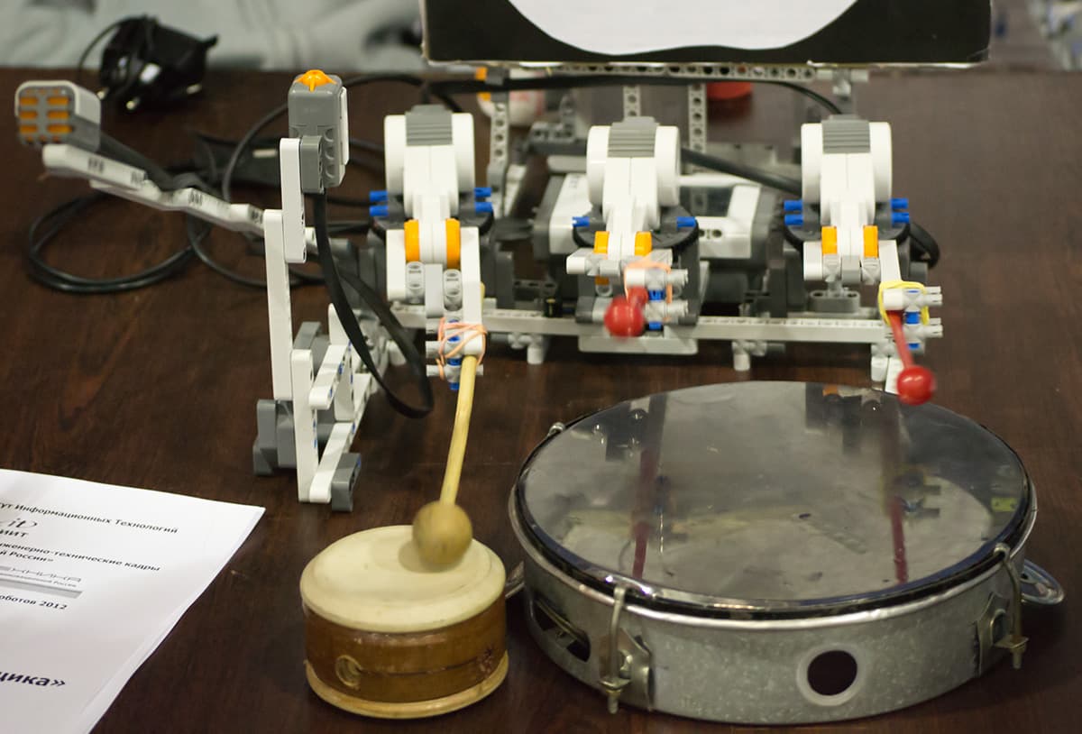 Робот-барабанщик, пока еще не научившийся выстукивать осмысленный ритм. Удар пластиковым молоточком в бубен совершенно не звучит. Почему они не использовали ксилофон?