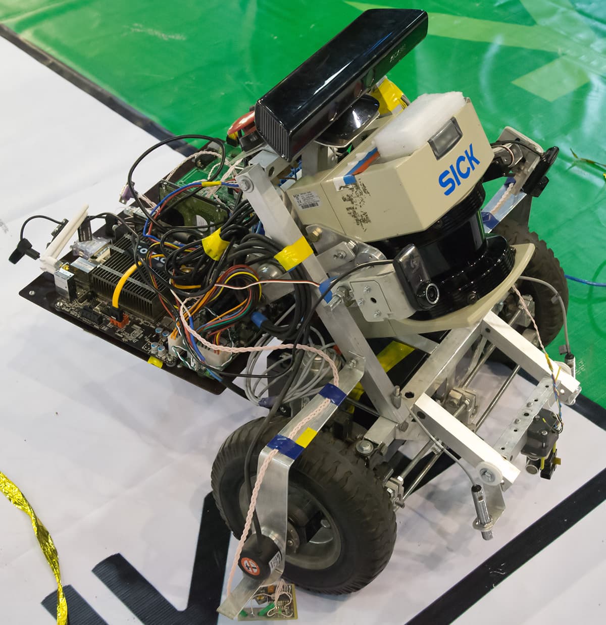 Этот робот также выполнен по схеме с двумя ведущими колесами и хвостовым роликом. Датчиков использовано очень много, самых разнообразных, в том числе и лазерный дальномер производства компании Sick. Управляется он компьютером на базе обычной материнской платы Mini-ITX.