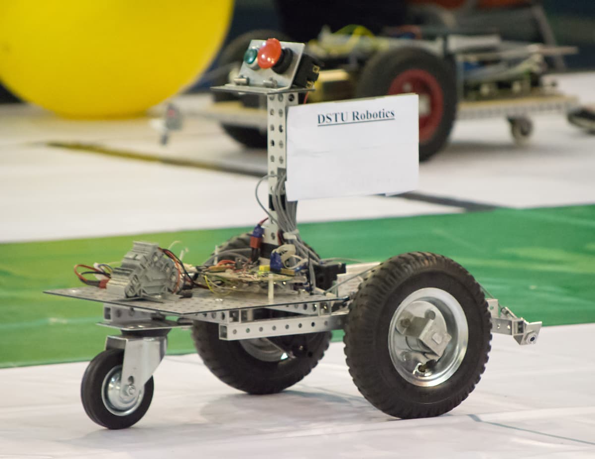 Симпатичный робот DSTU Robotics построен по классической схеме — два ведущих колеса и задний ролик-подпорка. Видны вынесенные за пределы колес датчики. К сожалению, небольшой аккумулятор и маломощные двигатели не позволяют ему развить большую скорость.