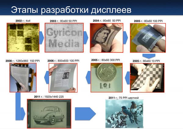 Главные преимущества: возможность создания гибких, ультратонких и устойчивых ко внешним воздействиям дисплеев без светодиодной подсветки, а также гибких дисплеев, способных показывать видео. Ниже наглядно показано, какой путь в сфере усовершенствования технологии (для практического применения) был пройден Plastic Logic.