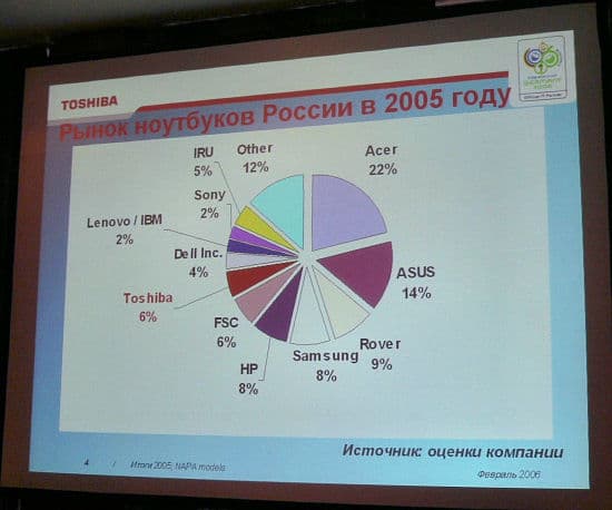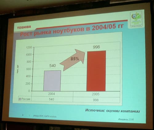 В то же время, по заявлению самого г-на Снытко, Toshiba гордиться особо нечем, потому что рост продаж Toshiba отставал от общего роста рынка. Некоторым утешением стал значительный рост спроса в 4-ом квартале, однако тут же потребители опять столкнулись с дефицитом поставок ноутбуков, так что извлечь из этого значительную пользу не удалось.