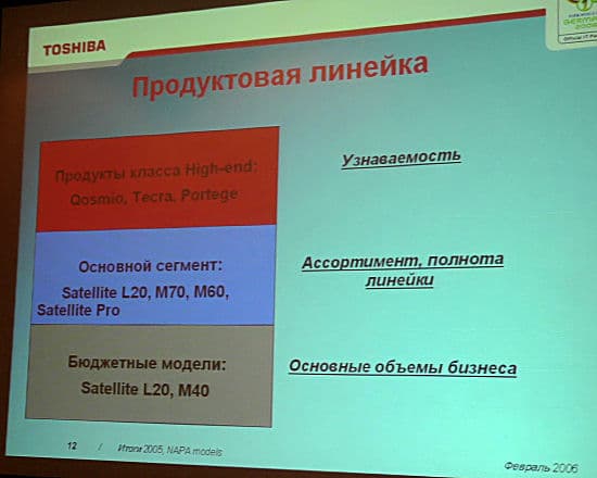 Далее было представлено распределение рынка по долям по версии Toshiba. Данные собирались из разных источников, в том числе заказанных исследований рынка, информации от партнеров и пр. Как видно, доля Toshiba на рынке оценивается 6% (при этом особенно подчеркивалось, что это данные только по официально поставляемой продукции). Это немало в сравнении, например, с долями Sony и IBM. Очень впечатляюще выглядит доля Acer в 22%. Хотя мне лично данные распределения долей показались немного странными, такое впечатление, что что-то не учитывалось. Хотя полностью корректно оценить российский рынок, учитывая серые схемы, очень сложно.