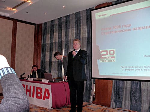 21 февраля в зале «Ломоносов» гостиницы «Шератон-Палас» состоялась презентация московского представительства Toshiba Europe, посвященная итогам 2005 года, планам компании на год 2006, а также представлению новых моделей ноутбуков. Презентацию проводили Игорь Снытко, теперь глава представительства, а также Олег Корчагин и Владимир Коротков.
