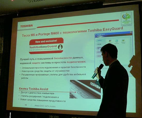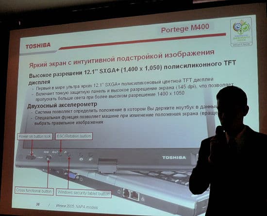 Вторая часть была посвящена презентации новых продуктов — портативного планшетного ПК Portege M400 и новой корпоративной модели Tecra M5.