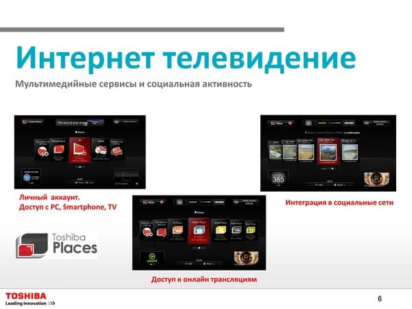 Компания развивает свой сервис Toshiba Places, который обеспечивает для зрителей доступ к различному контенту. Сейчас открыта регистрация. В будущем предполагается интегрировать в него локальные сервисы от партнеров Toshiba в России.