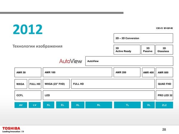 Здесь новинок представлено было очень много, так что этот раздел мы постараемся сократить. Но для начала посмотрим на основные технологии, использующиеся в телевизорах Toshiba 2012 года.