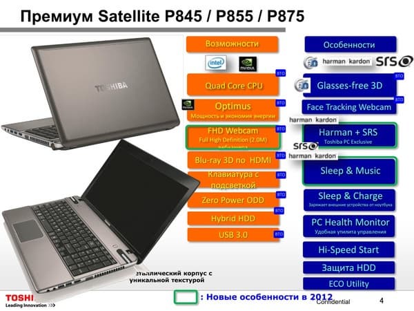 Подчеркну, зеленой рамкой обведены новшества 2012 года для этой линейки. Наиболее интересными особенностями я бы назвал отличную акустику, возможность установки монитора с трехмерной картинкой, не требующего очков. Впрочем, и остальные характеристики очень неплохие.