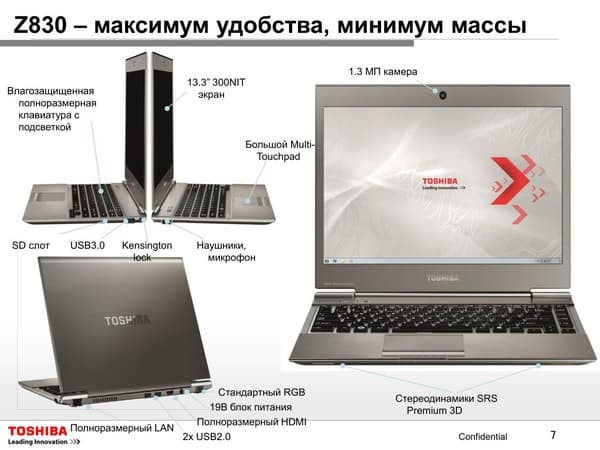 Наконец, флагман, но, так сказать, с другой стороны — ультрабук Portege Z830. Наверное, один из самых интересных ультрабуков, потрясающе тонкий, легкий (весит от от 1 до 1,1 кг), с прочным металлическим корпусом и полноценным набором портов.
