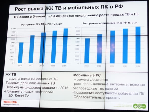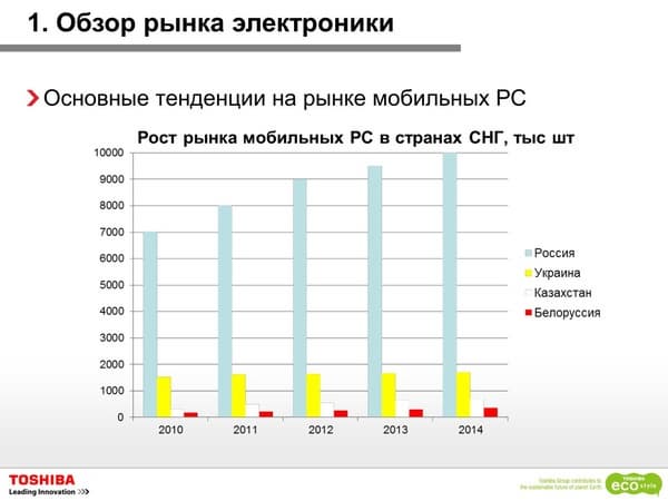 В принципе, рынок ноутбуков в России, по мнению Toshiba, также должен показывать очень серьезные темпы роста. В других странах они, согласно прогнозу, очень скромные, а украинский рынок и вовсе должен стоять на месте.