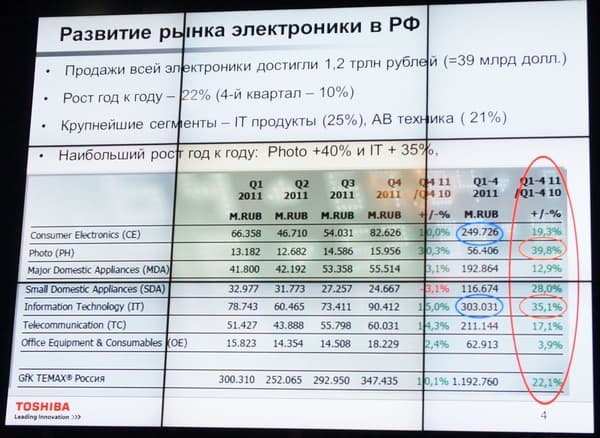 Toshiba наконец-то обратила внимание на Россию как на крупный и самостоятельный рынок. Раньше российский офис находился в подчинении у европейского и управлялся из Германии, что приводило к целому ряду нехороших последствий, например, не учитывалась специфика рынка (скажем, при подборе конфигураций). Кроме того, весьма ожидаемо, бытовая электроника и компьютеры (по крайней мере, домашние) все теснее сближаются и действительно постепенно становятся частью единой интегрированной системы, поэтому становится невыгодно и нецелесообразно иметь отдельный канал для поставки каждого из этих видов техники.