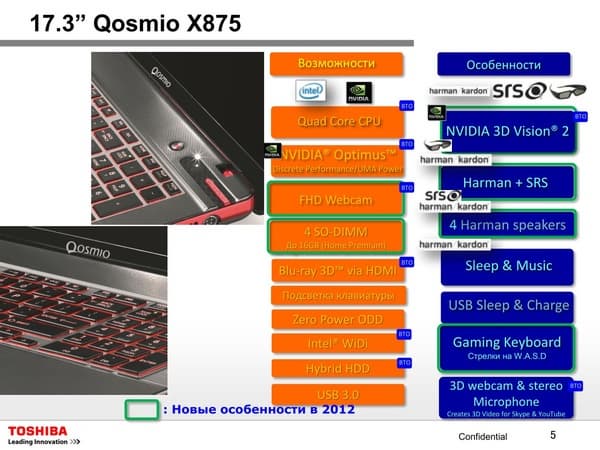 Флагман современной линейки, Toshiba Qosmio X870/875. Этот ноутбук будет иметь топовую, самую мощную платформу, но не только.