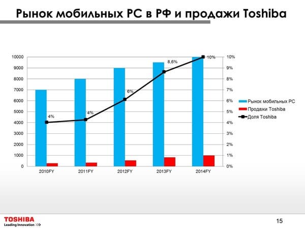 Как видите, пока доля Toshiba на этом рынке находится на уровне 4%, что немного. Компания надеется улучшить свое положение и к 2014 году достичь доли в 10% (предположительно, это уже в районе 3-го места). Заметим, что когда-то компания имела даже более высокую долю. Впрочем, учитывая, насколько забит рынок ноутбуков в России и насколько сильна на нем конкуренция, планы кажутся даже слишком амбициозными.