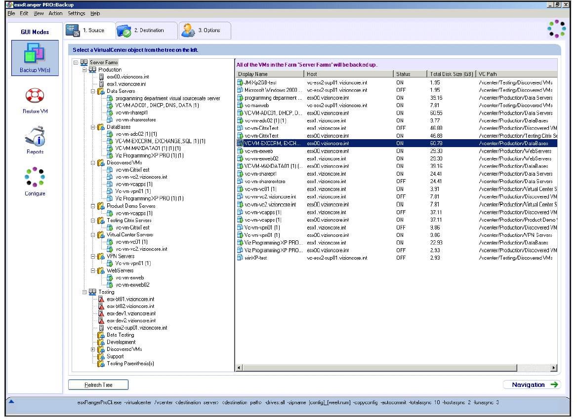 esxRanger обладает как GUI-интерфейсом, так и интерфейсом командной строки, что позволяет использовать обычный планировщик задач Windows для запуска работ резервного копирования по расписанию, что отменяет необходимость написания дополнительных скриптов. Главное окно продукта esxRanger представлено ниже:
