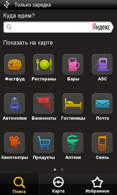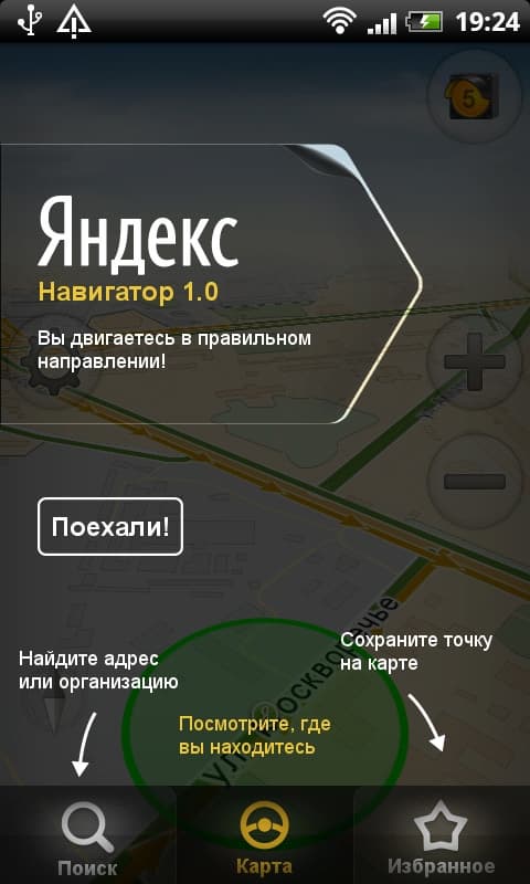 Яндекс.Навигатор способен рассчитывать время и расстояние в пути, автоматически увеличивать масштаб карты перед маневром, имеет дневной и ночной режимы, а также строит два варианта маршрута на выбор. Адреса при поиске предлагаются автоматически по мере вбивания первых букв в строку поиска. Приложение работает с тем модулем спутниковой системы, который встроен в смартфон, независимо от того, GPS это или ГЛОНАСС.