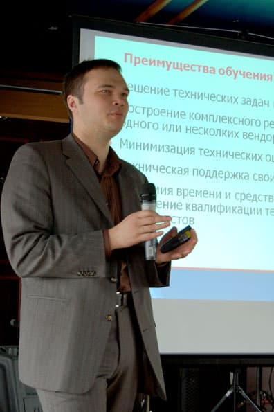 Александр Копанев, заместитель директора по продажам корпоративного оборудования, продолжил приветственную речь к партнерам компании, отметив, что любая компания может обратиться в представительство ZyXEL за консультацией по подбору оборудования в различных проектах, а также попросить оборудование для ознакомительного теста. «Сложно предлагать покупателю оборудование, которое никогда не держал в руках», — пояснил Александр смысл тестирования техники. Помимо тестирования, он также рассказал о возможности бесплатного обучения как сотрудников торговых организаций (для квалифицированных консультаций), так и заказчиков-инженеров, которым предстоит сделать выбор оборудования.