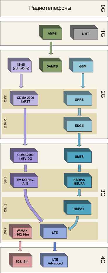 В чем большинство классификаторов сходятся, так это в делах давно свершившихся. С первым поколением (1G) определенность очевидна: это аналоговые NMT и AMPS, а также несколько местечковых стандартов, некоторые из которых живы и по сей день. Характерная особенность технологий первого поколения — использование цифрового канала только для служебного «общения» аппаратов с базовыми станциями. Передача голоса осуществляется в открытом виде, с использованием FM-модуляции, по сути мало чем отличаясь от иногда выделяемых в отдельное поколение (0G) радиотелефонов.