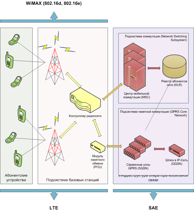 На иллюстрации изображены компоненты 2G-сетей, которые будут заменены или дополнены новыми технологиями: WiMAX/LTE работают с радиочастью, SAE дополняет традиционную архитектуру провайдера.