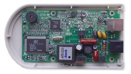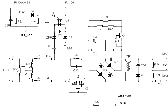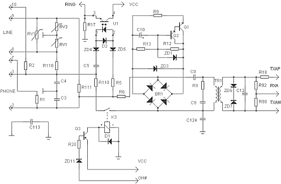 В ней, как и в ранее приводимых схемах нет особых излишеств, но предусмотрены защиты от перегрузок по максимально возможному току и напряжению. Несмотря на то, что на плате есть посадочные места для установки спаренного разъёма типа RJ-11, в модеме установлен одинарный разъём. Это может создать первоначальные трудности для тех, кто хочет подключить параллельный телефон непосредственно к модему. Выходом из положения может стать имеющийся в широкой продаже разветвитель гнезда RJ-11. При этом следует учитывать, что на время сеанса связи телефон отключаться не будет. Входные цепи выполнены по схеме с классической трансформаторной развязкой. Трансформатор залит компаундом, и поэтому можно только делать предположения о его истинных габаритных размерах. Впрочем, испытания с помощью комплексов измерительной аппаратуры от «Аналитик TC» показали, что именно на этих модемах входные цепи спроектированы наиболее оптимально, и не создают дополнительных нагрузок на телефонную линию.