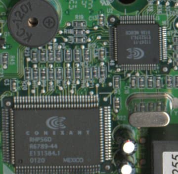 - Если внимательно изучить плату модема, то можно отметить, что кроме наличия возможности технологических замен (например, двухтранзисторную схему электронного дросселя на трёхтранзисторную, или герконовое наборное реле на оптоэлетронное) есть и вообще отсутствующие блоки. Так, во входных цепях аналоговой части имеются посадочные места под элементы аппаратного датчика контроля состоянием линии. Отсутствие такового объяснить просто — раз нет реле отключения гнезда PHONE, то и датчик становится излишеством. Но с другой стороны, это и запас прочности, т.е., если фирма решит вопрос о необходимости подобных внедрений в будущем, перестраивать технологический процесс производства плат не придётся.