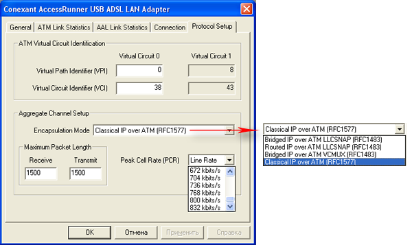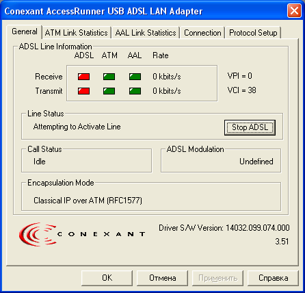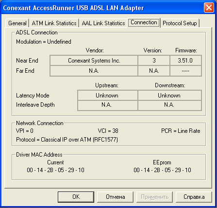 Практически все настройки модема задаются во время инсталляции драйвера, так что изменение каких-либо параметров может даже не потребоваться. PPPoE-соединение создается автоматически во время инсталляции драйвера (естественно, в случае использования подключения через PPPoE).