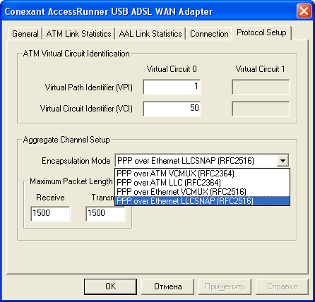 Здесь задаются параметры VPI/VCI — эта информация предоставляется провайдером услуг. Одновременно можно использовать только одну пару параметров VPI/VCI. Устройство также позволяет задать параметры MTU как для входящих, так и для исходящих пакетов.