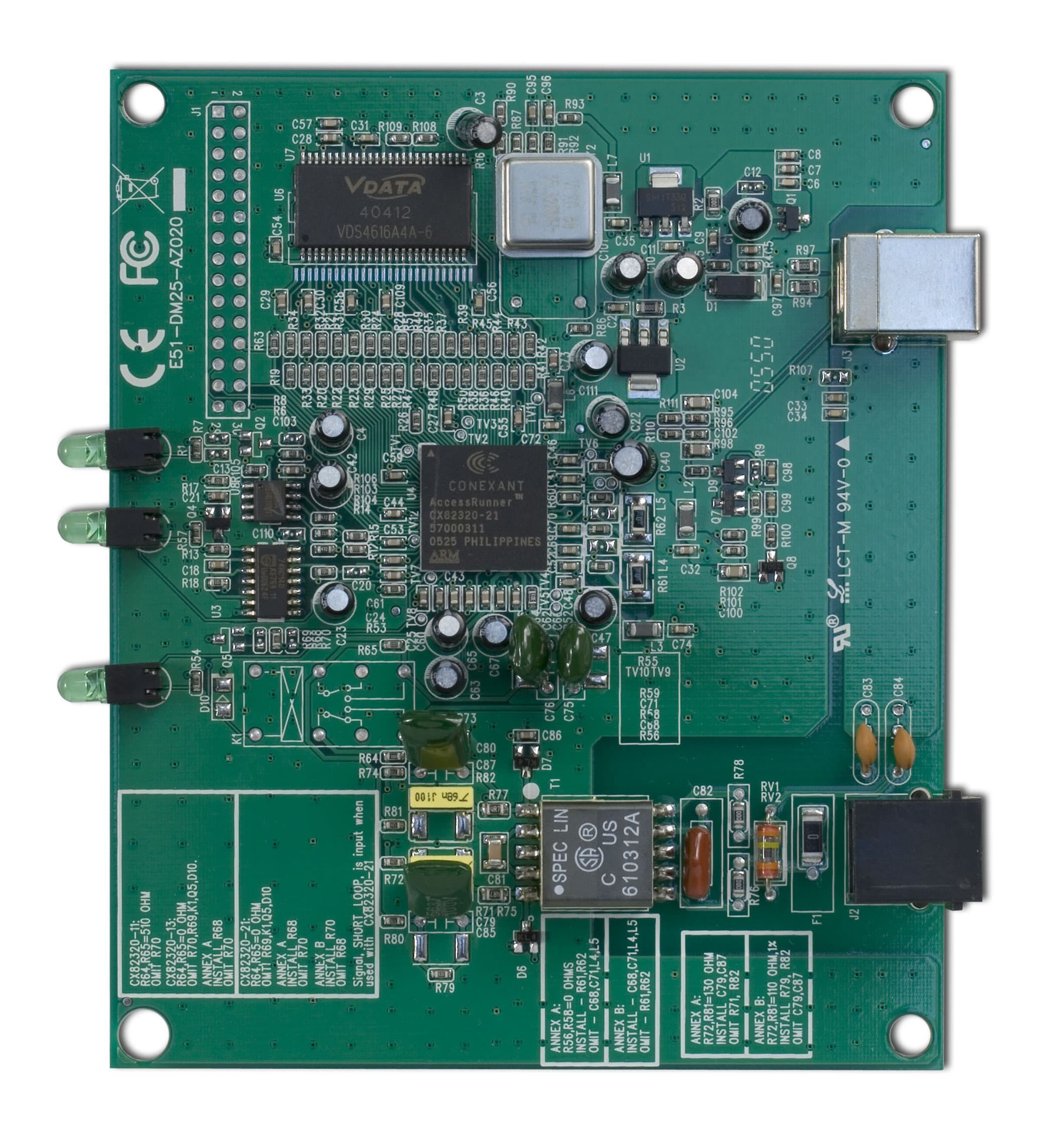 Устройство выполнено на базе процессора Conexant CX82320 (поддержка Annex A и Annex B, питание от USB-шины, USB 1.1).