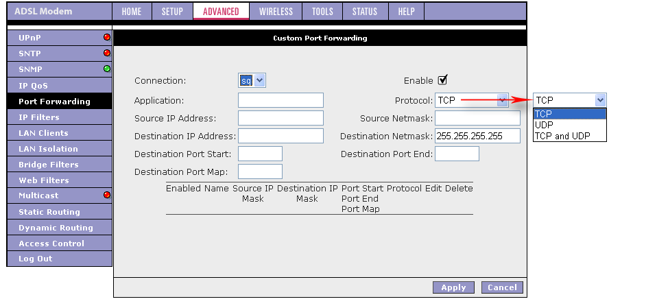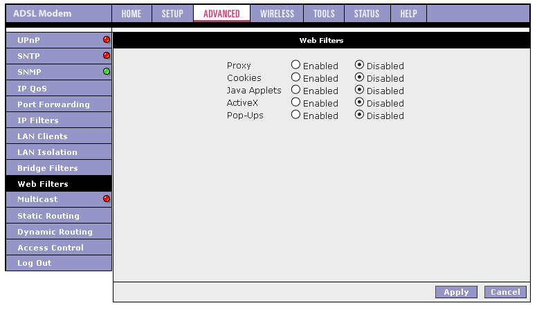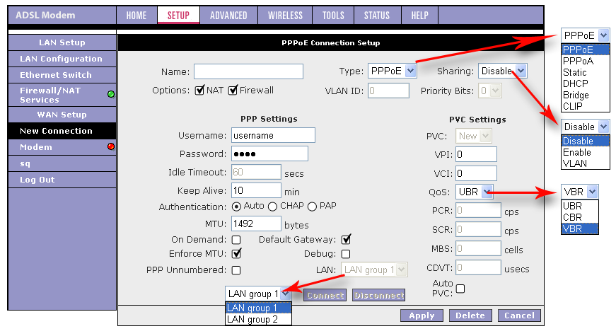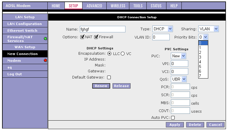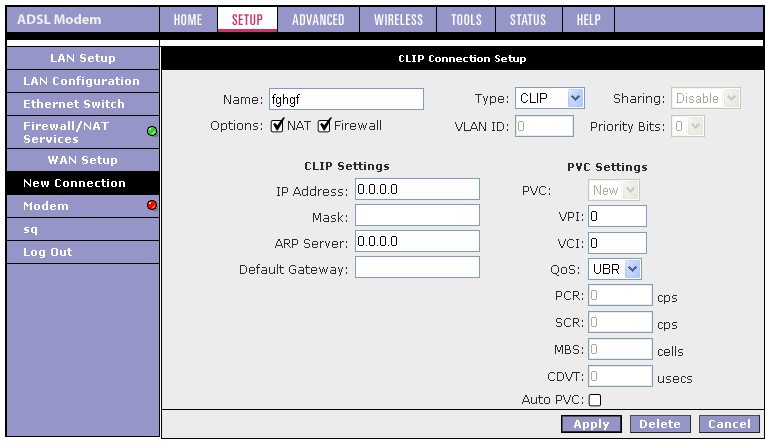Хочу также отметить, что если появится необходимость в изменении параметров ADSL-соединения, то придется удалить существующее соединение и заново его создать с новыми параметрами. Это вызывает некоторые неудобства (например, если я хочу изменить VPI и VCI соединения, то мне придется заново создать соединения и выставить вручную все остальные параметры).