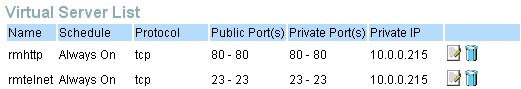 При включении возможности удаленного управления (Remote Access), разрешается доступ к WEB-интерфейсу и консольному интерфейсу устройства. Это достигается за счет создания 2-х виртуальных серверов, которые перенаправляют запросы, поступившие на WAN-интерфейс роутера, на адрес его интерфейса LAN (в данном случае адрес интерфейса LAN — 10.0.0.215).