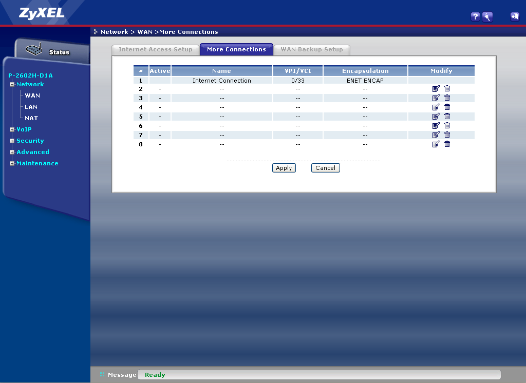 Принудительный выбор режима ADSL/ADSL2/ADSL2+ возможен только с использованием консольного интерфейса настройки. Также используя консольный интерфейс можно привязать виртуальный канал (с определенным значением VPI/VCI) к Ethernet-порту устройства.