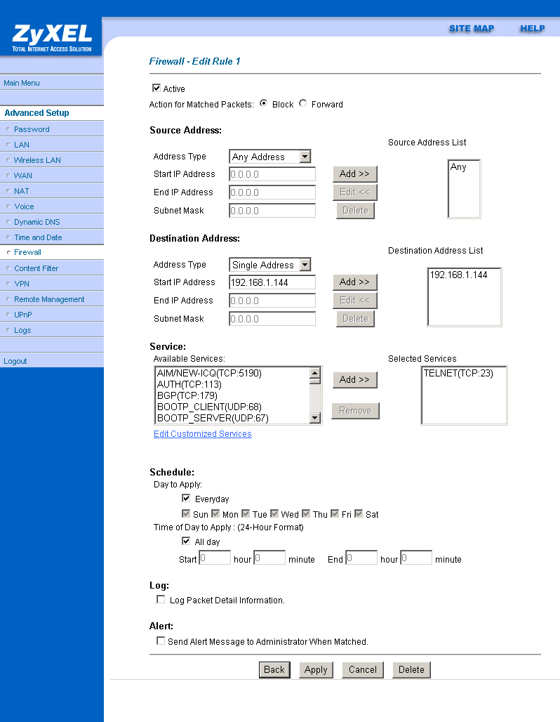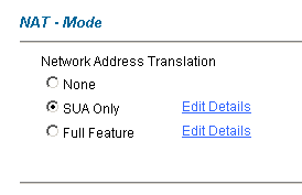 Рассматриваемый роутер позволяет достаточно подробно настроить сервис NAT (Network Address Translation — преобразование сетевых адресов). Возможно использование двух пунктов: "SUA Only" и "Full Feature"