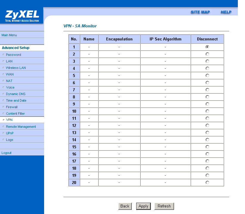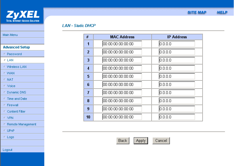 Настройки SUA Only NAT разрешают задать до 11 виртуальных серверов.