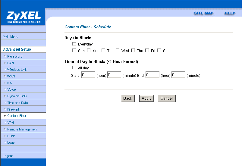 Контент-фильтр позволяет проводить фильтрацию, по словам, содержащимся в URL, но сразу после его включения никаких эффектов фильтрации не наблюдалось — я спокойно мог зайти на WEB-страницы, содержащие в URL заданные фразы. Позже выяснилось, что в расписании, по которому работает URL-фильтр, по умолчанию не указано время его работы и до активации расписания URL-фильтр не выполняет своих функций.