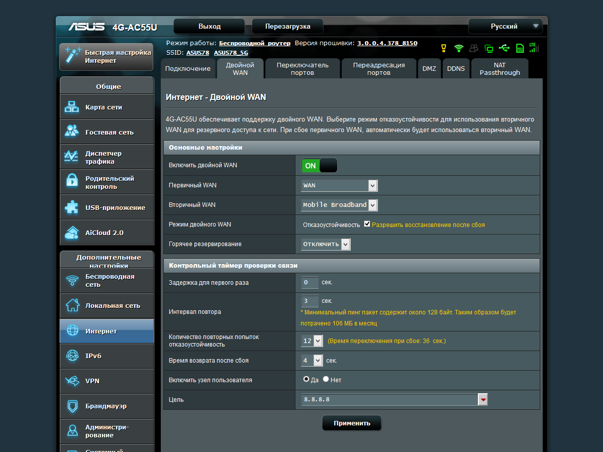 При использовании сразу двух каналов реализуется сценарий отказоустойчивости. В настройках режима «Dual WAN» предусмотрена функция восстановления исходного соединения через проверку доступности указанного пользователем хоста.