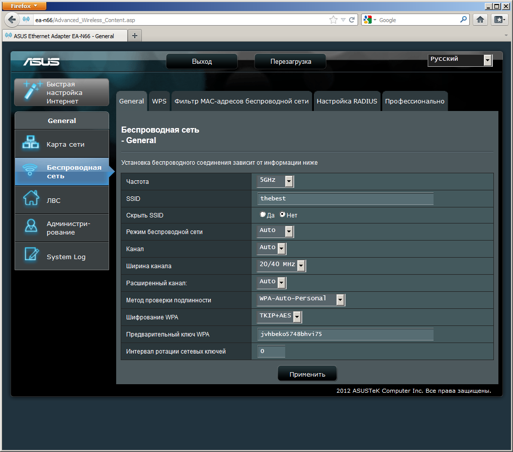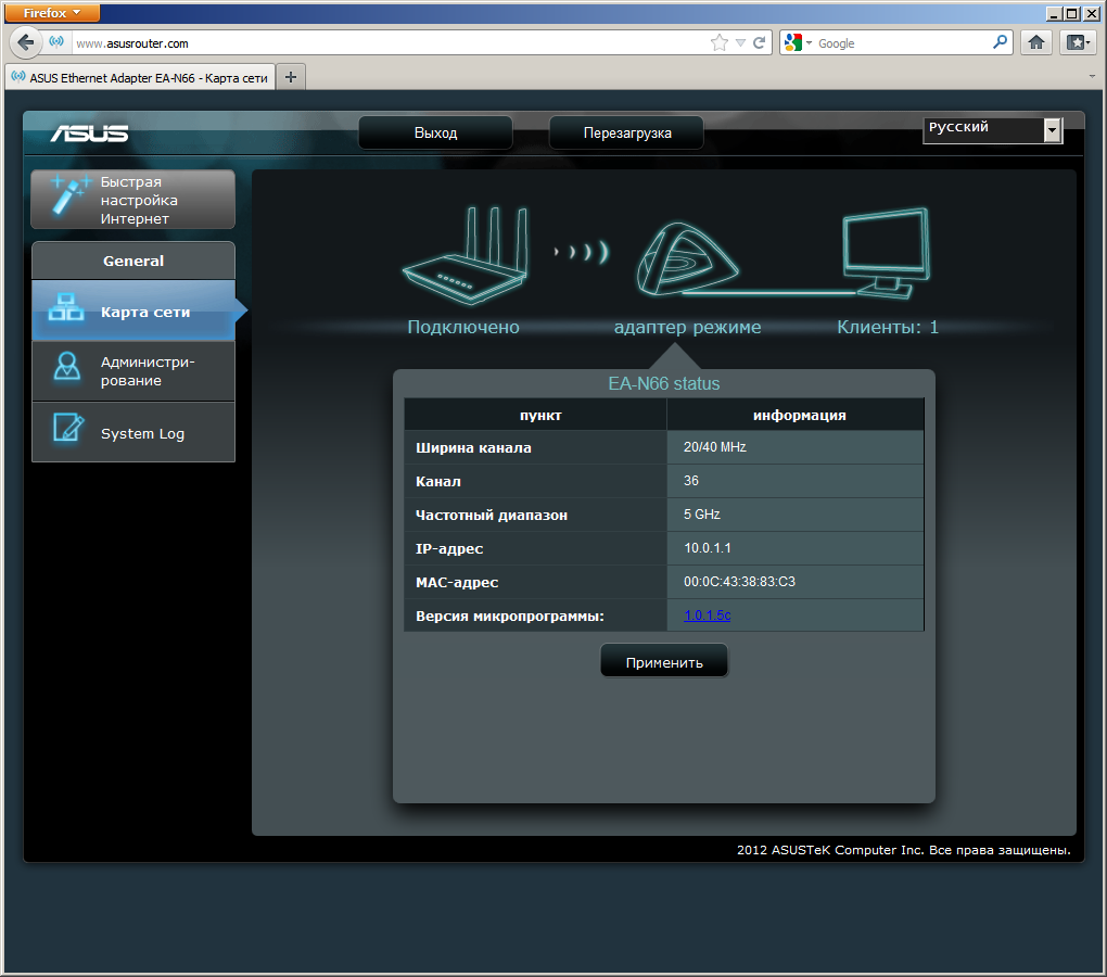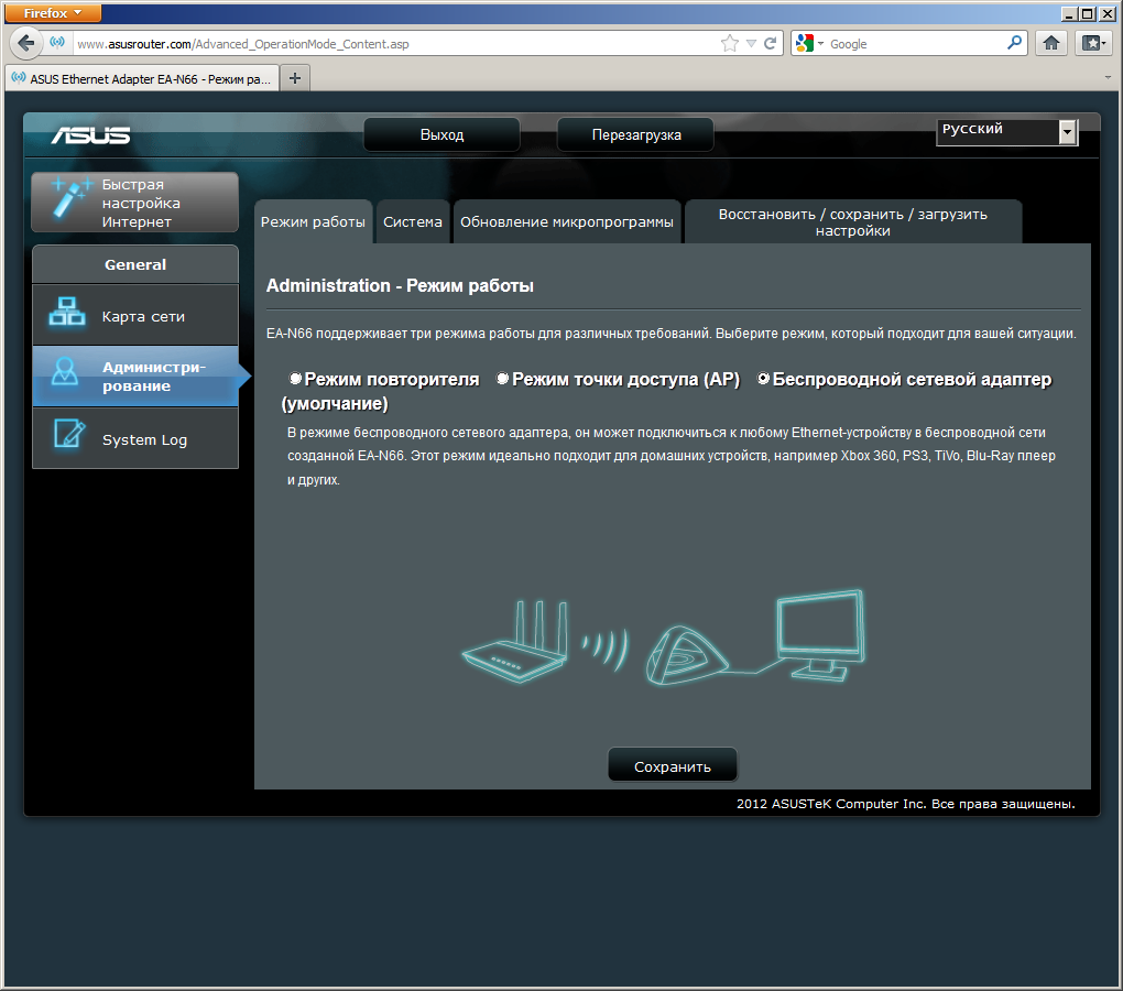 Как многие аналогичные модели, ASUS EA-N66 очень легко подключить в качестве клиента к бытовой технике без настройки на ПК. Достаточно использовать технологию WPS на вашем беспроводном роутере. В этом случае устройство работает в режиме Ethernet-адаптера, обеспечивая подключение к беспроводной сети одного или нескольких (при добавлении сетевого коммутатора) устройств. Но этим варианты использования не ограничиваются. Кроме сетевого моста, устройство может выступать в ролях беспроводной точки доступа и повторителя. Настройка в этом случае осуществляется через web-интерфейс. Для доступа к нему необходимо использовать адрес http://www.asusnetwork.net или http://www.asusrouter.com в браузере на подключенном к устройству компьютере.