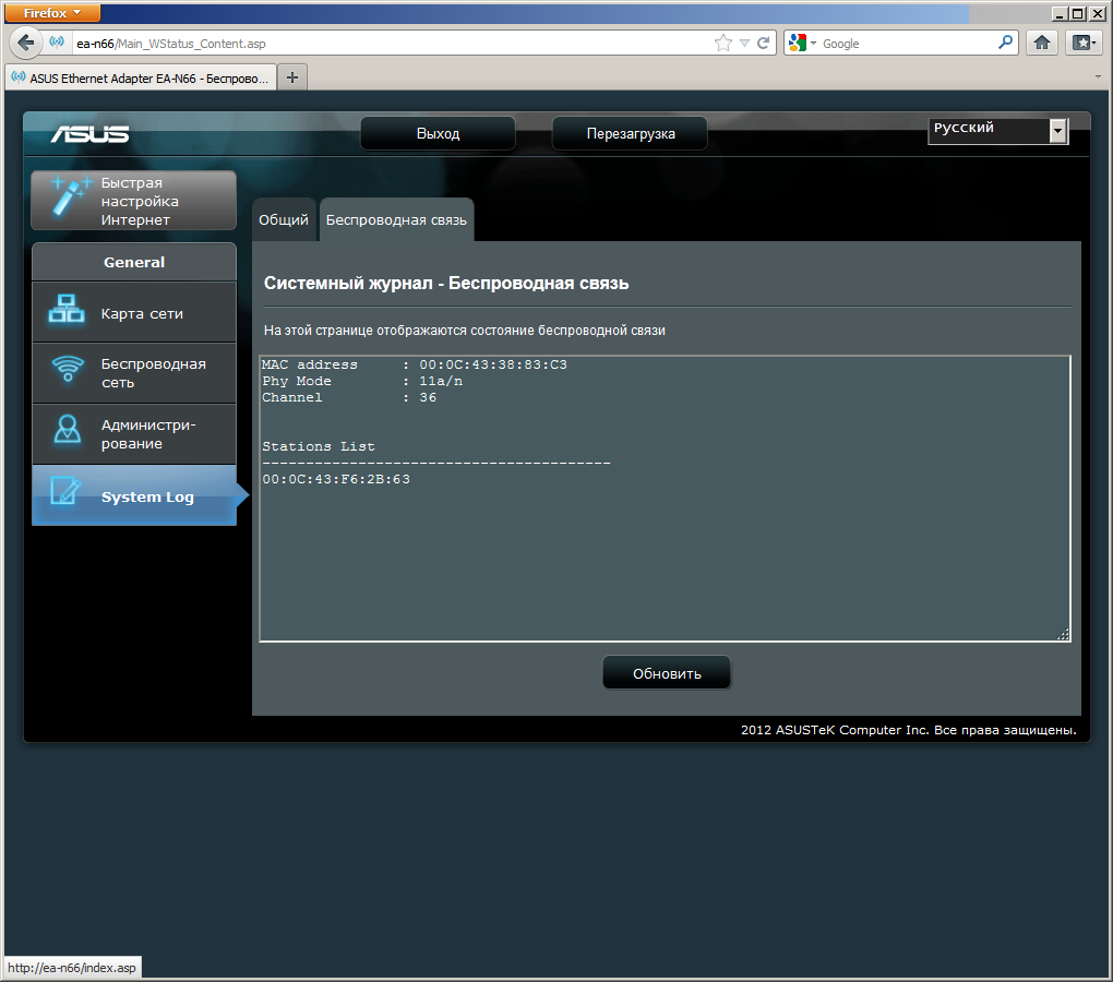 Системный журнал предоставляет собой стандартный лог операционной системы, никаких настроек детализации для него не предусмотрено, есть отправка на сервер syslog (недоступно в режиме клиента). Для режимов точки доступа и повторителя дополнительно есть закладка «Беспроводная связь», где можно уточнить MAC-адрес беспроводного модуля, режим его работы и номер канала, список текущих подключенных клиентов.