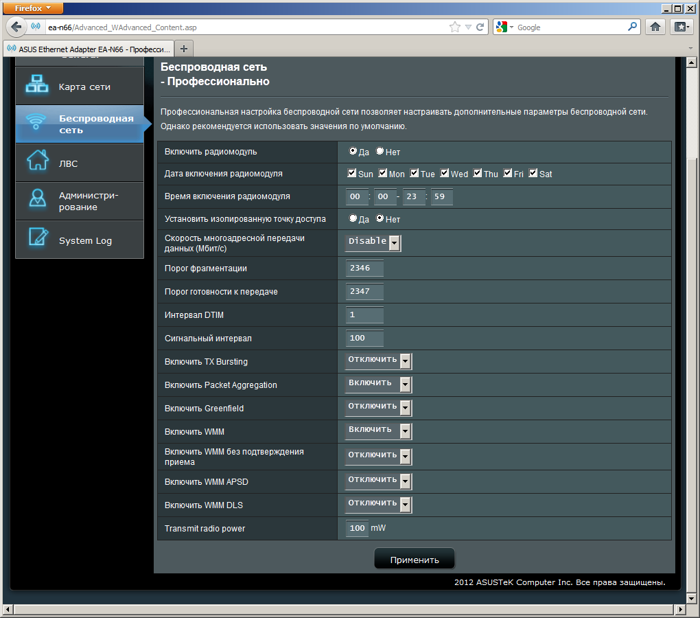 На закладке «Профессионально» можно установить время работы радиомодуля (один диапазон времени на выбранные дни недели), настроить WMM, установить мощность сигнала и изменить некоторые специальные параметры работы Wi-Fi. Для ширины канала используется установка «20» или «20/40». К сожалению, изменение опций не всегда срабатывает — использованная (первая) версия прошивки явно требует доработки. В частности двухканальный режим у нас заработал только в диапазоне 5 ГГц.
