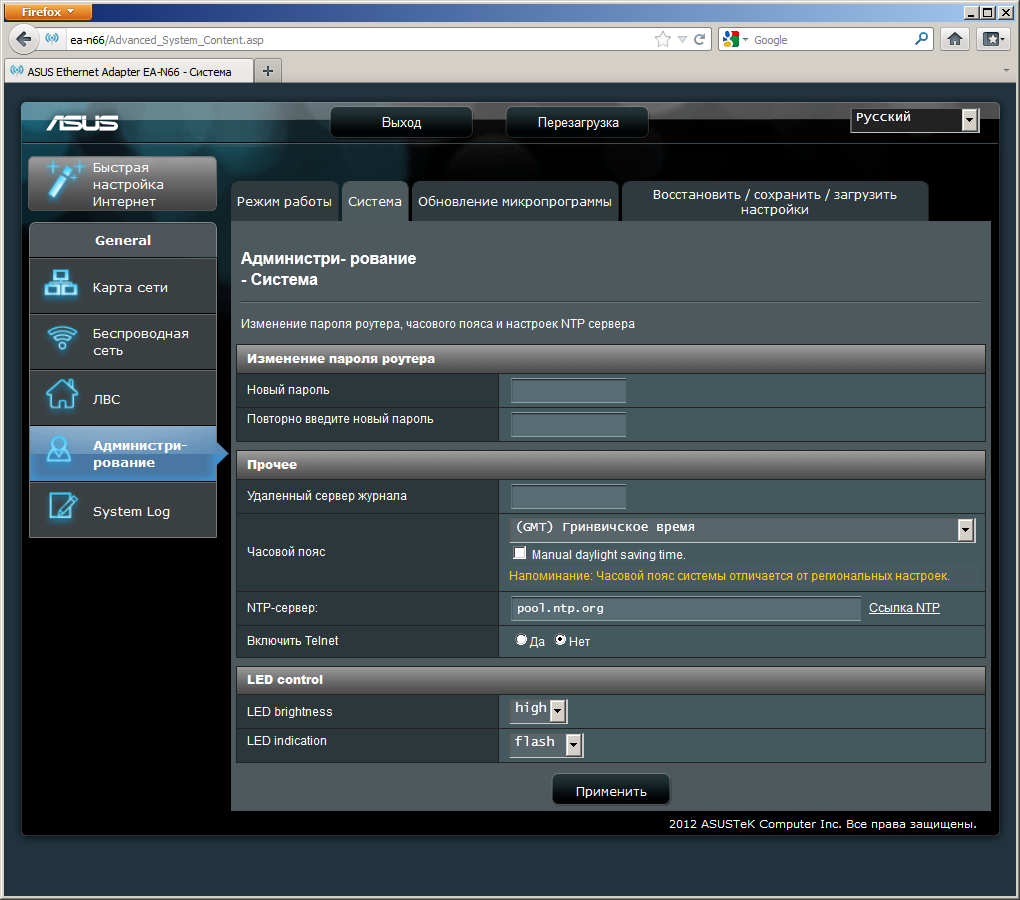 Общими для всех режимов работы пунктами настройки являются «Администрирование» и «Системный журнал». В первом из них пользователь может изменить режим, обновить прошивку, сохранить/восстановить/сбросить конфигурацию устройства, изменить пароль администратора, установить часы (недоступно в режиме клиента), включить доступ к консоли по telnet, выбрать яркость свечения индикаторов или выключить их. В некоторых случаях изменение режима требует предварительного полного сброса устройства.