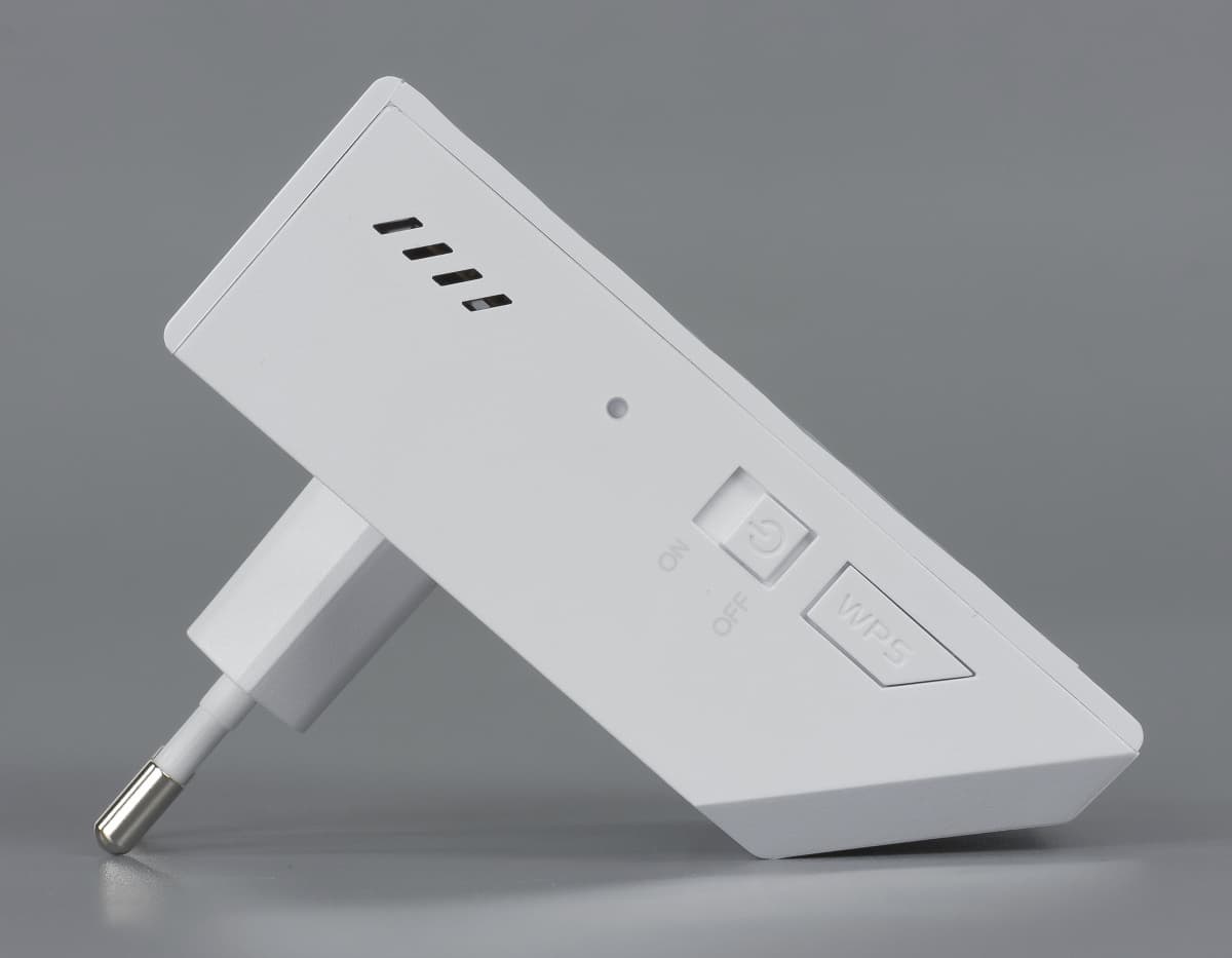В одном корпусе устройство совмещает электронную начинку и блок питания. Внешние размеры составляют 55×30×85 мм без учета вилки. Используется белый пластик, лицевая сторона повторителя имеет характерный «бриллиантовый» дизайн, верхняя часть просто глянцевая, а для всего остального использовано практичное матовое покрытие.